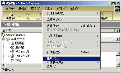 使用Outlook进行POP3收信和SMTP发信认证的设置 1〕 点击菜单“工具”中的“帐号”;如下图所示: