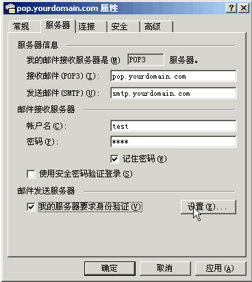 10〕 设定SMTP验证及修改POP3服务器地址可选择“服务器”标签; 11〕 在“外发邮件服务器”下面的“我的服务器要求身份验证”选项打勾,并按“设置”按钮(注意,不要选择“使用验证密码安全登陆”)。如下图所示: