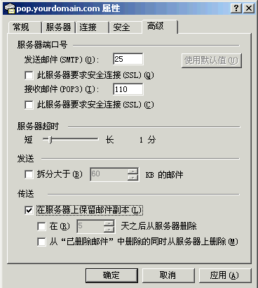 13〕假如用户希望在收信之后,不删除服务器上的邮件,你可以在Outlook Express的“高级”标签里面设置“在服务器上保留邮件副本”。