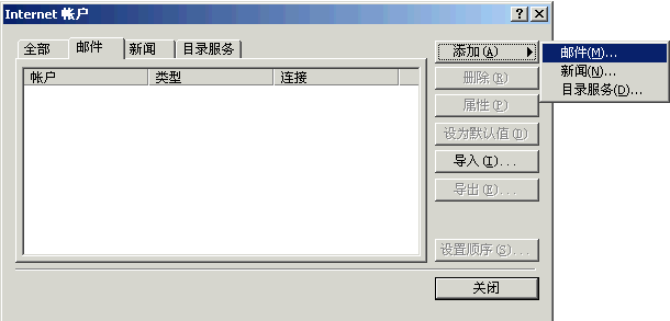 2〕 在弹出窗口“Internet帐号”对话框中,单击“添加”按钮选择“邮件”;如下图所示: