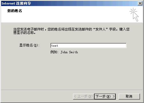 3〕 进入到“Internet连接向导”填入用户的名字,点击下一步;如下图所示: