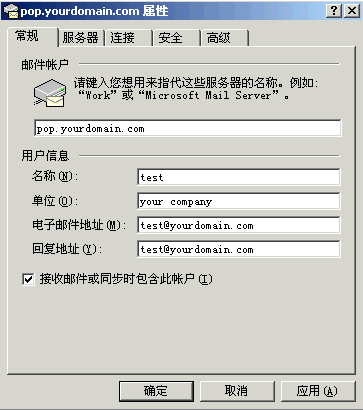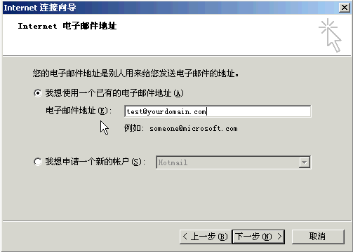 4〕 填写你在yourdomain.com邮局里申请到的电子邮件地址到“电子邮件地址”里,如下图所示: