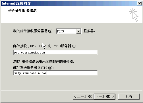 5〕 接收邮件服务器选为“POP3”,在接收邮件服务器POP3的地方填入“pop.yourdomain.com”或者“yourdomain.com”,而在发送邮件服务器SMTP填入“smtp.yourdomain.com”,点击下一步;如下图所示: