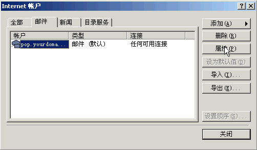 8〕 同样,要修改用户设置请点击菜单中的“工具”->“帐号”,选择好你想要设定的帐号,按“属性”。如下图所示: